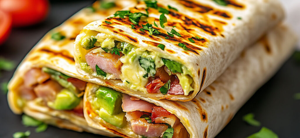 BURRITOS DE QUESO MARIBO, JAMÓN Y DIP DE TOCINETA CON AGUACATE