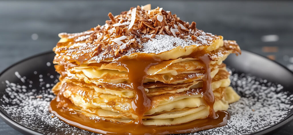 Montaje: Se espolvorea el azúcar glass sobre la milhojas de crepe y se termina de decorar con el coco y la ralladura de limón.